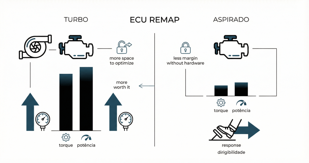 Em motor turbo, o remap costuma entregar ganhos maiores, porque existe “espaço” para melhorar pressão e torque dentro de limites. Em aspirado, sem mudanças mecânicas, os ganhos de potência são menores — a maior diferença costuma ser resposta e dirigibilidade.