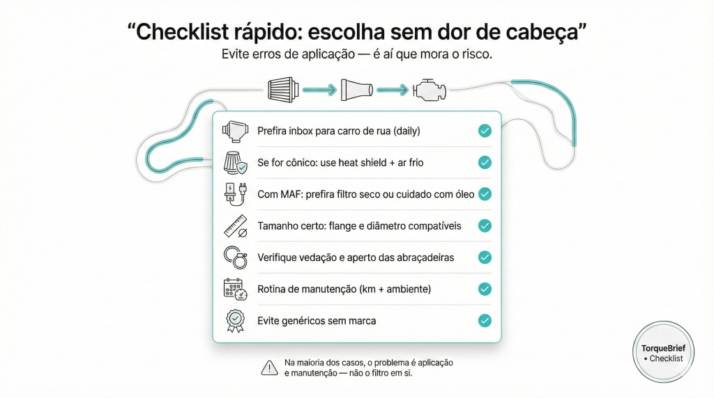 Se você quer evitar que filtro de ar esportivo prejudica o motor, use este checklist (e lembre: filtro de ar esportivo prejudica o motor quase sempre por erro de aplicação, não por existir):